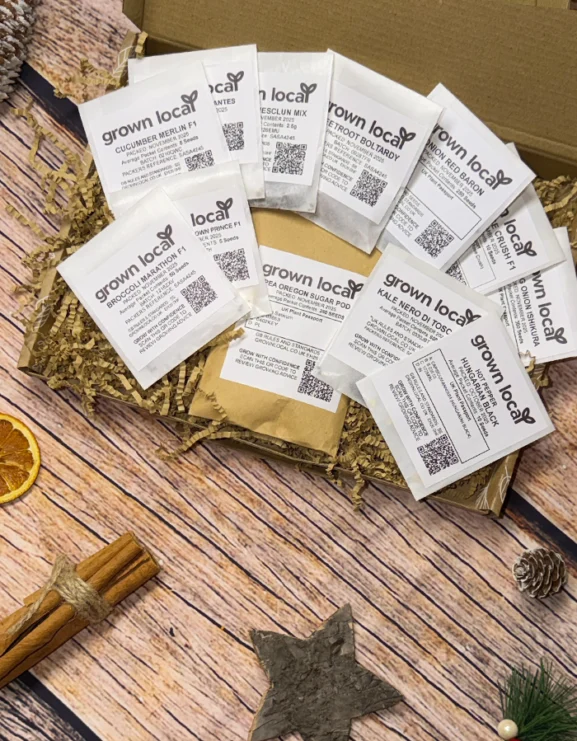 Every box is packed with shredded tissue and finished with a seasonal postcard, ready to give — perfect for Secret Santa, distant friends, or anyone who enjoys planning their veg patch as winter settles in.